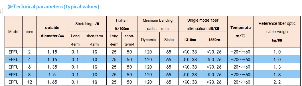 Η δομή του καλωδίου αποτελείται από σφιχτά διατεταγμένες ίνες μονής λειτουργίας ή πολλαπλών λειτουργιών (οι οποίες μπορεί να περιέχουν ίνες πλήρωσης) που σχηματίζουν μια κανονική διαμόρφωση. Μετά τη θεραπεία της ρητίνης σε μια δέσμη ινών, η δέσμη τοποθετείται κεντρικά και εξωθείται με θήκη πολυαιθυλενίου υψηλής πυκνότητας.